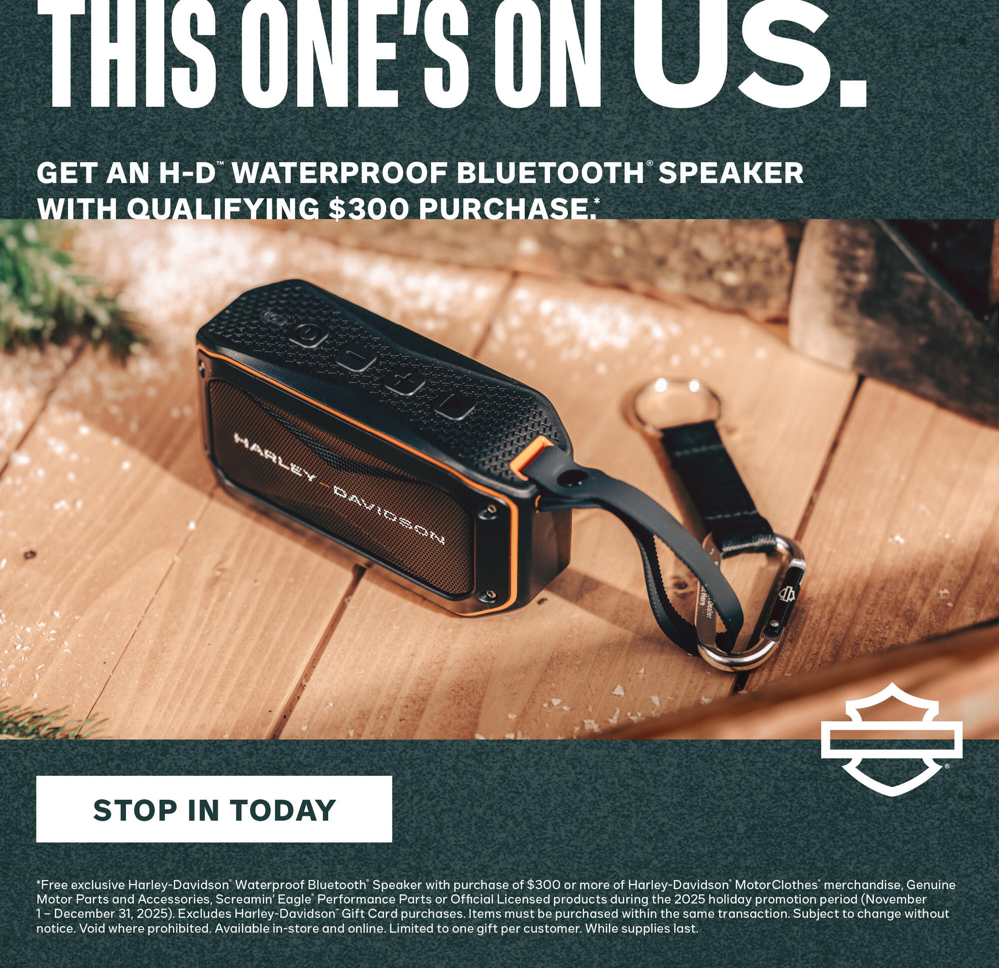 *Free exclusive Harley-Davidson Waterproof Bluetooth Speaker with purchase of $300 or more of Harley-Davidson® MotorClothes* merchandise, Genuine Motor Parts and Accessories, Screamin' Eagle Performance Parts or Official Licensed products during the 2025 winter promotion period (ends December 31, 2025). Excludes Harley-Davidson Gift Card purchases. Items must be purchased within the same transaction. Subject to change without notice. Void where prohibited. Limited to one gift per customer. While supplies last.