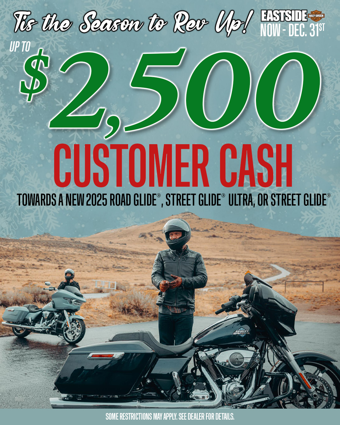 Now through December 31st, you can get up to $2,500 in value toward a new 2025 Road Glide®, Street Glide® Ultra, or Street Glide®. Eligible Models:• 2025 Road Glide® — $2,500 Customer Cash