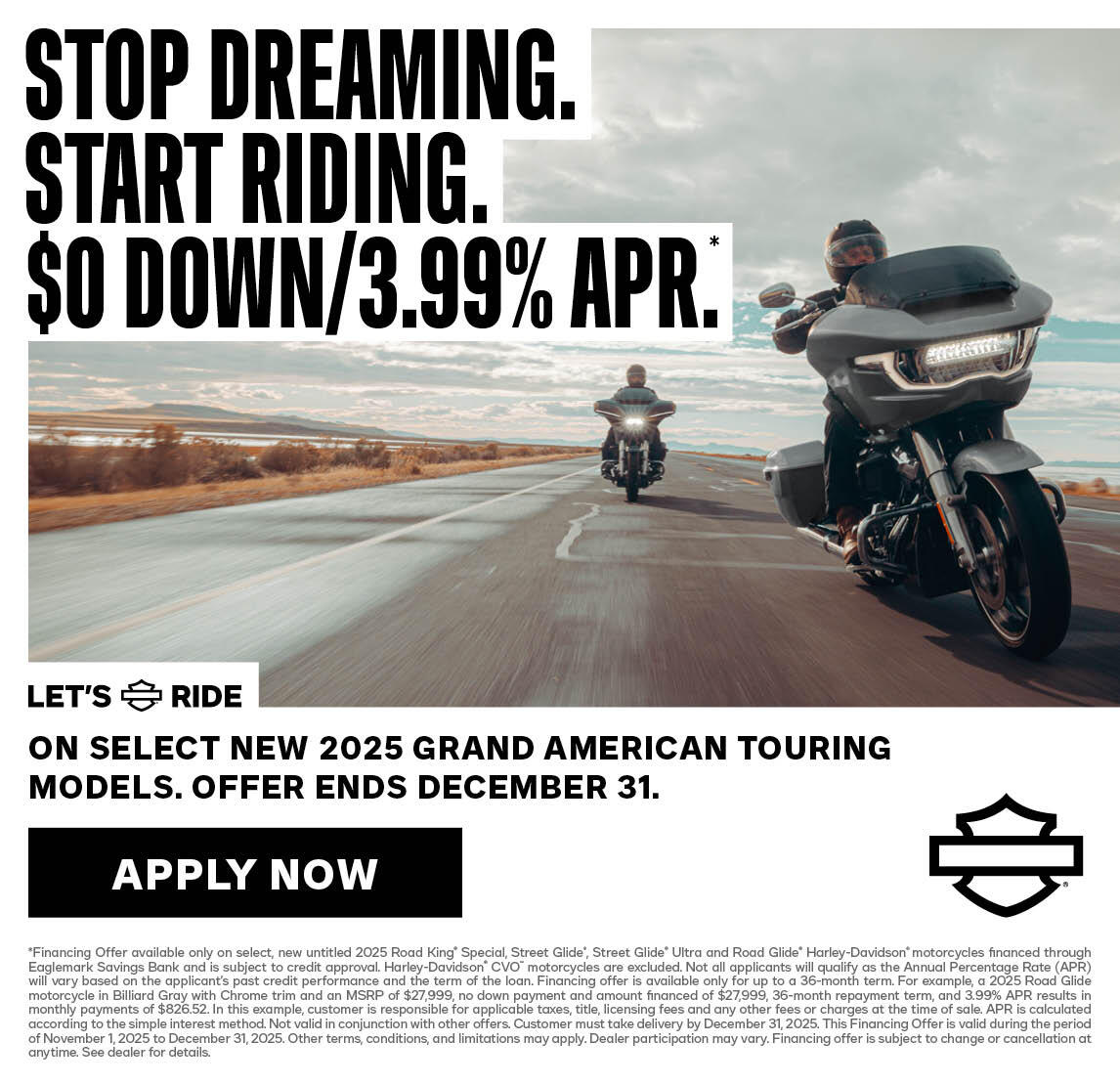 Don't wait for Santa. Ride home today. Take advantage of and get rates as low as 3.99% APR and $0 down on select new 2025 Grand American Touring Models